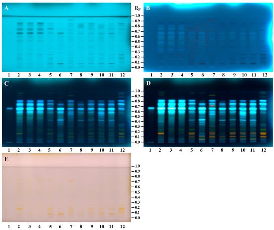After derivatization with NP reagent, a pattern of three light-blue fluorescent zones at RF values ≈ 0.35, 0.38, and 0.43 (Figure 2C, tracks 5–11) was observed at 366 nm only for S-bee pollen (Figure 2C, tracks 5–11). The intensity of these zones further increased after the application of PEG reagent (Figure 2D, tracks 5–11). Additionally, one green- (RF ≈ 0.92), one red- (RF ≈ 0.72), and two orange-colored (RF ≈ 0.41 and 0.31) zones were detected at 366 nm after using PEG reagent in only one (S3; Figure 2D, track 7) of the seven S-bee pollen samples (Figure 2D, tracks 5–11). These four zones were detected as orange with white light after application of PEG reagent (Figure 2E, track 7). Zones at RF ≈ 0.11, colored yellow after using NP reagent and orange after using PEG reagent, were detected at 366 nm in S-bee pollen (Figure 2D, tracks 5–11); C. sativa (Figure 2D, track 2); and Quercus spp. (Figure 2D, track 12). These zones were also orange at white light after the application of PEG reagent in all bee pollen samples from Salix spp. (Figure 2E, tracks 5–11) and Quercus spp. (Figure 2E, track 12) but not in C-bee pollen (Figure 2E, tracks 2–4). Zones at RF ≈ 0.16 and 0.19, colored yellow after derivatization with NP reagent and orange after application of PEG reagent, were detected at 366 nm in S-bee pollen (Figure 2C,D, tracks 5, 7, 9–11), C-bee pollen (Figure 2C,D, track 2), and Q-bee pollen (Figure 2C,D, track 12). These zones were also orange at white light after the application of PEG reagent (Figure 2E, tracks 2, 5, 7, and 9–12). After the application of PEG reagent, orange-brown zones (RF ≈ 0.05; Figure 2E, tracks 5–11)) and yellow zones (RF ≈ 0.74, 0.52; Figure 2E, tracks 2–4) were detected with white light in S-bee pollen and C-bee pollen, respectively.