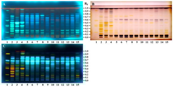 HPTLC NH2 F254S plate developed with ethyl acetate–formic acid–water (35:4:4, v/v/v), documented after derivatization with anisaldehyde/H2SO4 reagent (at 366 nm (A) and white light (B)) and after derivatization with NP/PEG reagents (at 366 nm (C)). Applications per band: track 1: Standard MIX; track 2: C. sativa androecia (0.1 mg); track 3: S. alba androecia (0.1 mg); track 4: Q. pubescens androecia (0.1 mg); tracks 5–7: C-bee pollen (C1–C3, 0.1 mg); tracks 8–14: S-bee pollen (S1–S7, 0.1 mg); track 15: Q-bee pollen (Q1, 0.1 mg).