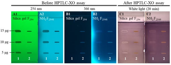 Comparison of HPTLC-XO assay on HPTLC silica gel F254 and HPTLC NH2 F254S plates using allopurinol (positive control, track 1) and N1,N5,N10-tricaffeoylspermidine (track 2) applied on the plates after development with ethyl acetate–formic acid–water (35:4:4, v/v/v). Plates were documented before HPTLC-XO assay at 254 nm (A1,A2) and 366 nm (B1,B2) and under white light (20 min) after the HPTLC-XO assay (C1,C2).