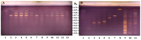 HPTLC NH2 F254S plate developed with ethyl acetate–formic acid–water (35:4:4, v/v/v), documented under white light after HPTLC-XO assay. Applications per band: (A) track 1: allopurinol (15 µg); track 2: N1,N5,N10-tricaffeoylspermidine (5 μg); tracks 3–5: C-bee pollen (C1–C3, 0.25 mg); tracks 6–12: S-bee pollen (S1–S7, 0.25 mg); track 13: Q-bee pollen (Q1, 0.25 mg). (B) track 1: allopurinol (15 µg); track 2: rutin (5 μg); track 3: hyperoside (5 μg); track 4: isoquercitrin (5 μg); track 5: myricitrin (5 μg); track 6: quercitrin (5 μg); track 7: N1,N5,N10-tricaffeoylspermidine (5 μg); track 8: quercetin (5 μg); track 9: C. sativa androecia (0.25 mg); track 10: S. alba androecia (0.25 mg); track 11: Q. pubescens androecia (0.25 mg).