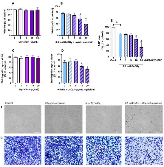 Effect of myricitrin on the viability of SH-SY5Y cells under physiological conditions and following exposure to excess copper ions. SH-SY5Y cells were treated with myricitrin at concentrations of up to 20 µg/mL for 24 h. Cell viability was assessed using the MTT assay (A,B), crystal violet staining (C,D), and ATP content measurement (E). Morphological changes in SH-SY5Y cells were observed using the EVOS Floid Cell Imaging System (F) and were also photographed following crystal violet staining (G). Statistical analysis was performed using one-way ANOVA followed by Dunnett’s multiple comparison tests. a p < 0.05, b p < 0.01, c p < 0.001, and d p < 0.0001 vs. 0 group (0.5 mM CuSO4). Data are presented as means ± standard deviation from 3 to 4 independent experiments (one-way ANOVA followed by post hoc Dunnett’s test).