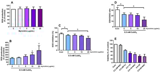 Effect of myricitrin on ROS production, SOD activity, and GSH/GSSG ratio. SH-SY5Y cells were treated with 1–20 µg/mL myricitrin alone or in the presence of 0.5 mM CuSO4. After 24 h, ROS levels were measured using 2′,7′-dichlorodihydrofluorescein diacetate (A,B). SOD activity was determined using a colorimetric assay. The rate of the reduction in superoxide anions in a reaction with molecular oxygen is related to xanthine oxidase activity that is inhibited by SOD (C). The GSH/GSSG ratio was determined using a luminescence-based system involving glutathione-S-transferase coupled to a luciferase reaction (D). Effect of N-acetylcysteine, a GSH precursor, on cell survival in SH-SY5Y treated with copper and 10 or 20 µg/mL myricitrin was determined by MTT assay (E). Results are presented as mean values ± standard deviation from 3 to 5 independent experiments performed in triplicate. a p < 0.05, b p < 0.01, and d p < 0.0001 compared to copper-only treatment (one-way ANOVA followed by post hoc Dunnett’s test for (A,B,D,E); Student’s t-test for (C)).