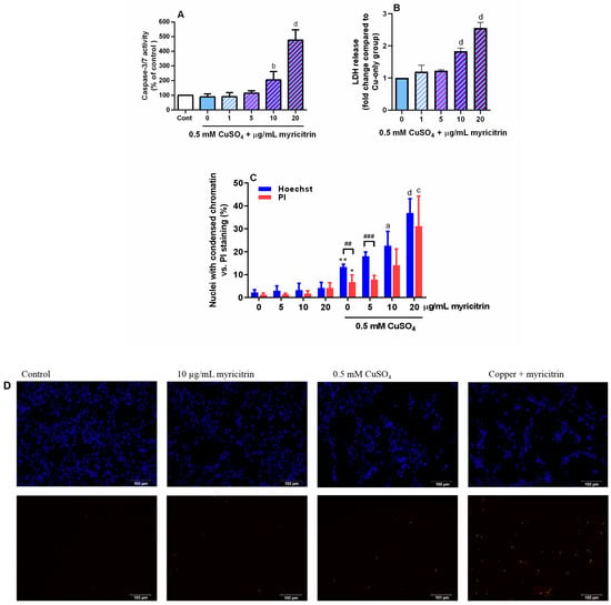 Effects of copper and myricitrin co-treatment on caspase-3/7 activity, membrane integrity, and nuclear changes. SH-SY5Y cells were treated with 0.5 mM CuSO4 and myricitrin (1–20 µg/mL), and caspase-3/7 activity was measured using a luminogenic substrate (A). Membrane damage was assessed by measuring LDH activity in the culture medium (B). Chromatin condensation was assessed using Hoechst 33342 staining, while propidium iodide staining was used to detect cells in late apoptosis/necrosis (C). Data are presented as mean values ± standard deviation from three independent experiments performed in duplicate (A,C) or triplicate (B). * p < 0.05, ** p < 0.01 vs. control group; a p < 0.05, b p < 0.01, c p < 0.001, and d p < 0.0001 vs. copper alone (one-way ANOVA followed by post hoc Dunnett’s test) and ## p < 0.01, ### p < 0.01 (Student’s t-test). Representative images obtained by staining with Hoechst 33342 (blue) and propidium iodide (red) were taken using the EVOS Floid Cell Imaging System (D).