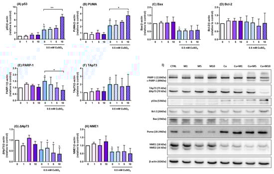 Effects of copper and myricitrin on the expression of apoptotic and oxidative stress-related proteins. Protein expression levels of p53 (A), PUMA (B), Bax (C), Bcl-2 (D), PARP-1 (E), TAp73 (F), ΔNp73 (G), and NME1 (H) were assessed 24 h after exposure to 0.5 mM CuSO4 and/or 1, 5, and 10 µg/mL myricitrin. Total cellular proteins were extracted, separated by polyacrylamide gel electrophoresis, and transferred to nitrocellulose membranes. The membranes were incubated with specific primary antibodies, and subsequently with horseradish peroxidase-conjugated secondary antibodies. Protein bands were visualized using enhanced chemiluminescence. β-actin was used as a loading control to normalize protein expression levels. Data are presented as mean ± SD from 3 to 4 independent experiments. Densitometric analysis was performed using ImageJ (Fiji) software. Data were analyzed using an unpaired t-test (* p < 0.05, ** p < 0.01 vs. copper group; a p < 0.05, b p < 0.01, and c p < 0.001 vs. control group). Representative Western blot images are shown in (I).
