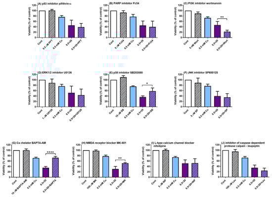 Effects of specific inhibitors and modulators of intracellular signalling pathways on the neurotoxic effect of myricitrin. Cells were treated simultaneously with 0.5 mM CuSO4 and 20 µg/mL myricitrin in combination with the following inhibitors: pifithrin-α (p53 inhibitor) (A), PJ34 (PARP inhibitor) (B), wortmannin (PI3K/Akt inhibitor) (C), U0126 (ERK1/2 inhibitor) (D), SB203580 (p38 inhibitor) (E), SP600125 (JNK inhibitor) (F), BAPTA-AM (intracellular calcium chelator) (G), MK-801 (NMDA receptor channel blocker) (H), nifedipine L-type calcium channel inhibitor) (I), and leupeptin (calpain inhibitor) (J). Inhibitors were applied 1 h prior to and during the 24 h treatment with copper and myricitrin. Data are presented as means ± SD from 3 to 5 independent experiments performed in triplicate. * p < 0.05, ** p < 0.01, and **** p < 0.0001 vs. copper + myricitrin treatment (one-way ANOVA followed by post hoc Tukey’s test).