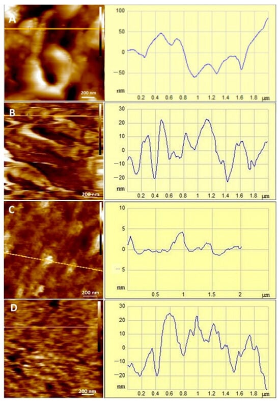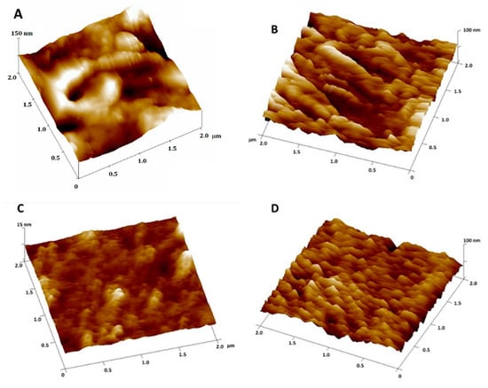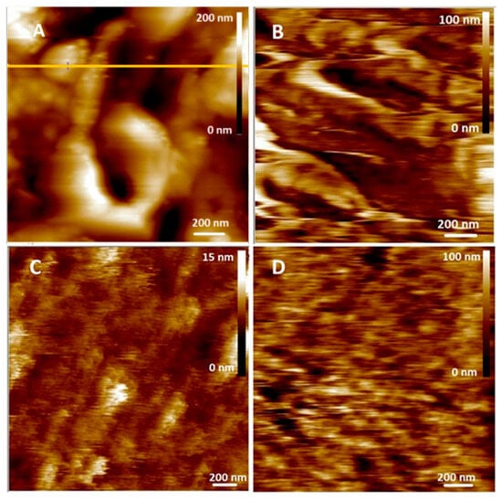 On the height images, relatively clear and distinct protrusions were observed on the control cells, indicating the presence of organized, soft, separated filamentous structures (Figure 6A and Figure 8A), up to 50 nm high (see section analysis in Figure 7A). The filamentous structures, which are inhomogeneously distributed across the scanned area, form depressions up to 55 nm deep in the interstices. The separated filament with homogenous distribution over the analyzed cell surface and a somewhat rougher surface were observed in our previous study [48], after the treatment of SH-SY5Y cells with myricetin. The slight difference in roughness between this and the previous experiments could be explained by the AFM measurements. Even though the AFM measurements were performed under the same conditions, the sharpness, size, and radius of curvature of each new probe used are different, which results in an exclusion of some surface features and slightly lower resolution. However, all the measurements presented in this paper were performed with the same probe and the comparison of the data obtained by comparing each treated cell sample with the control group ensures the high accuracy of the observed data [57].