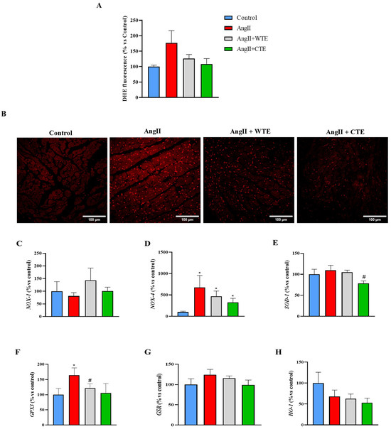 The quantification of reactive oxygen species (A) and representative images of heart sections stained with dihydroethidium (B). The scale bar is equivalent to 100 μm. The gene expression of NADPH oxidase 1 (C), NADPH oxidase 4 (D), superoxide dismutase 1 (E), glutathione peroxidase 3 (F), glutathione reductase (G), and Hemoxigenase 1 (H) in aorta of mice fed on a standard chow for 8 weeks and infused with saline for the last 4 weeks (control); mice fed on a standard chow for 8 weeks and infused with for the last 4 weeks (AngII); mice fed on a standard chow supplemented with White Tea Extract for 8 weeks and infused with AngII for the last 4 weeks (AngII + WTE); and mice fed on a standard chow supplemented with Complex Tea Extract for 8 weeks and infused with AngII for the last 4 weeks (AngII + CTE). Data are represented as mean value ± SEM, n = 8–10 mice/group, and expressed as a percentage vs. control; * p < 0.5 vs. control; # p < 0.05 vs. AngII.