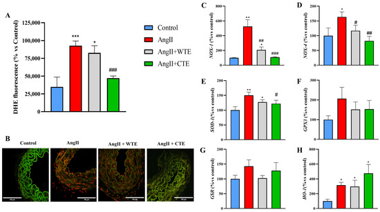 The quantification of reactive oxygen species (A) and representative images of aorta sections stained with dihydroethidium (B). The scale bar is equivalent to 100 μm. The gene expression of NADPH oxidase 1 (C), NADPH oxidase 4 (D), superoxide dismutase 1 (E), glutathione peroxidase 3 (F), glutathione reductase (G), and Hemoxigenase 1 (H) in aorta of mice fed on a standard chow for 8 weeks and infused with saline for the last 4 weeks (control); mice fed on a standard chow for 8 weeks and infused with AngII for the last 4 weeks (AngII); mice fed on a standard chow supplemented with White Tea Extract for 8 weeks and infused with AngII for the last 4 weeks (AngII + WTE); and mice fed on a standard chow supplemented with Complex Tea Extract for 8 weeks and infused with AngII for the last 4 weeks (AngII + CTE). Data are represented as mean value ± SEM, n = 8–10 mice/group, and expressed as a percentage vs. control; * p < 0.05 vs. control; ** p < 0.01 vs. control; *** p < 0.001 vs. control; # p < 0.05 vs. AngII; ## p < 0.01 vs. AngII; ### p < 0.001 vs. AngII.