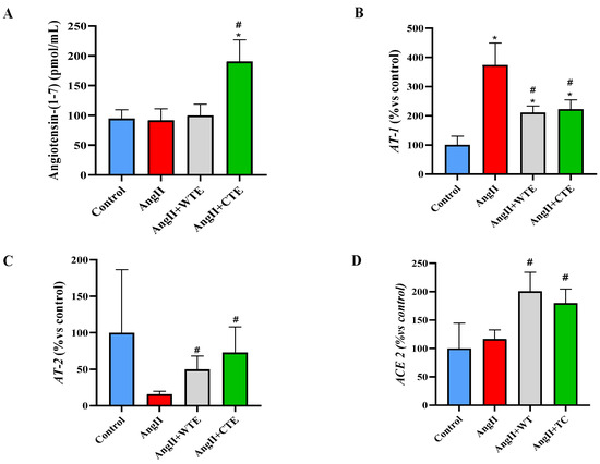 Plasma levels of angiotensin-(1-7) (A) and gene expression of angiotensin II receptor type 1 (B), angiotensin II receptor type 2 (C), and angiotensin I-converting enzyme 2 (D) in aortic tissue of mice fed on a standard chow for 8 weeks and infused with saline for the last 4 weeks (control); mice fed on a standard chow for 8 weeks and infused with AngII for the last 4 weeks (AngII); mice fed on a standard chow supplemented with White Tea Extract for 8 weeks and infused with AngII for the last 4 weeks (AngII + WTE); and mice fed on a standard chow supplemented with Complex Tea Extract for 8 weeks and infused with AngII for the last 4 weeks (AngII + CTE). Data are represented as mean value ± SEM, n = 8–10 mice/group, and expressed as a percentage vs. control; * p < 0.05 vs. control; # p < 0.05 vs. AngII.