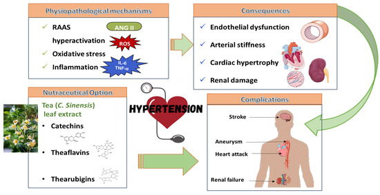 Mechanisms and complications of hypertension and tea supplementation as a nutraceutical option to support cardiovascular health and particularly the cardiovascular alterations associated with hypertension.