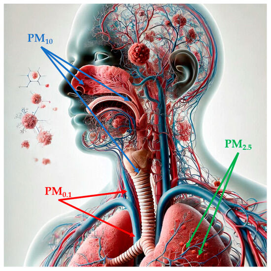 PM, a mixture of solid particles and liquid droplets, which presents high variability in size and may consist of hundreds of different chemicals, is considered the most reliable indicator of air pollution [17,47]. Notably, PM is classified according to its aerodynamic diameter: particles sized smaller than 10 µM in diameter (PM10), also called inhalable particles; PM2.5, known as fine particles; and PM0.1, or ultrafine particles, with a diameter, which is smaller than 0.1 µM [48]. Particle size is strongly correlated with health-related effects of PM since, with the decrease in size, particles may progressively deposit in the nasal, pharyngeal and laryngeal passages, trachea, and bronchi (PM10) in the respiratory bronchioles and alveoli (PM2.5) and, through the respiratory surfaces, in the systemic circulation (PM0.1) (Figure 1) [48,49,50,51]. PM2.5 can also originate directly from both natural sources, such as dust storms, volcanic eruptions, forest fires, and anthropogenic sources like inefficient fuel combustion and agricultural waste burning (primary PM2.5) or produced through physical (coagulation, condensation) and chemical processes involving pollutants such as NO2 and SO2 [47,48,52,53]. Increasing evidence has shown a risk association between short- and long-term exposure to ambient PM2.5 and PTB, mortality or incidence for cardiovascular and respiratory diseases, lung cancer, and type 2 diabetes [54]. In 2019, PM2.5-related deaths totaled nearly 4.2 million, an increase of 102.3% from 1990 to 2019, and with ischemic heart disease, stroke, and chronic obstructive pulmonary disease as the three leading causes of death [54]. According to the 2021 WHO Air Quality Guidelines, the recommended annual and daily average levels for PM2.5 should not exceed 5 and 15 µg/m3, respectively [55]. As for PM10, the WHO recommendation corresponds to an annual level of 15 µg/m3, based on the assessment of the long-term effects of PM10 (i.e., mortality) and not considering that a large proportion of PM10 consists of PM2.5 [56]. Importantly, in 2022, most of the European urban population was exposed to concentrations of PM2.5 (96%) and PM10 (83%) above WHO guidelines, despite ongoing emission reduction policies [57].