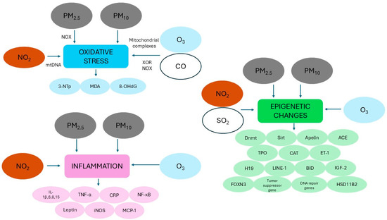 - Oxidative stress plays a primary role in mediating systemic responses triggered by PM from the initial locus of the airways and lungs, including cardiovascular outcomes [51,62]. In addition to containing reactive oxygen species (ROS, including superoxide radicals, hydrogen peroxide, and hydroxyl radicals), PM may lead to the overproduction of endogenous ROS through redox reactions of the particles with sensory receptors on alveoli surfaces [62,63,64]. Alternatively, upon achieving access to the bloodstream, PM may interact with vascular cells in the endothelium, resulting in the disruption of cellular antioxidant signaling [65]. Exposure to PM2.5 can promote the increased expression of NADPH oxidase 4 (Nox4), the most important Nox isoform in the heart, which, by transferring an electron to molecular oxygen, is considered to be among the main sources of oxidative stress [60,66]. Oxidative stress, promoting lipid peroxidation and protein oxidation, causes systemic inflammation, which in turn can be responsible for the development of endothelial dysfunction, atherosclerosis, up to the onset of cardiac dysfunction with arrhythmia and heart rate variability, cardiac remodeling and heart failure, and thrombosis [63,64]. In particular, an excess of superoxide radicals may interact with nitric oxide, generating peroxynitrite, a reactive intermediate that, in addition to producing DNA strand breaks and lipid membrane damage, can bind to tyrosine residues of proteins, giving rise to 3-nitrotyrosine (3-NTp), considered a stable product of protein nitration and a reliable biomarker of nitrosative stress, which is in turn associated with pathological pregnancies [64]. Interestingly, placental levels of 3-NTp have been shown to increase by 35% for each interquartile range (IQR) increment in PM2.5 over the entire pregnancy, therefore posing a risk for the developing fetus [65]. In addition, within the same birth cohort study, each IQR increment in PM10 exposure during the first and second trimesters of pregnancy was associated with increased levels of mitochondrial 8-hydroxy-2′-deoxyguanosine (8-OHdG, a marker of DNA oxidative damage) in umbilical cord blood of 23% and 16.6%, respectively, while no significant associations were found with exposure to PM2.5, suggesting that the early- and mid-pregnancy are potentially harmful for adverse birth outcomes [67,68]. Recently, research conducted on a cohort of 305 American pregnant women documented increased urinary 8-OHdG levels during the second trimester in relation to one IQR increase in the average cumulative PM2.5 concentration in the 3–7 days before urine collection, indicating that the rapid growth of the placenta and fetus can contribute to the marked increase in oxidative stress levels [68]. In the same cohort, each IQR increase in the PM2.5 concentration in the first trimester was also associated with an 8.2% increment in malondialdehyde, a marker of lipid peroxidation, in the first trimester, whereas no associations were found in the other two trimesters [68].