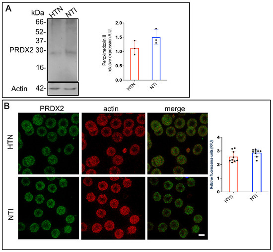 The oxygen-transporting function of hemoglobin within erythrocytes is highly vulnerable to oxidative [27]. However, erythrocytes are equipped with peroxiredoxin II (PRDX2), an antioxidant enzyme that neutralizes reactive oxygen species (ROS) generated internally and in tissues they interact with. To investigate whether PRDX2 is sufficient to counteract ROS in erythrocytes from hypertensive (HTN) patients, membrane skeletons from erythrocytes of HTN patients and normotensive individuals (NTI) were analyzed via Western blotting. A ~22 kDa band corresponding to PRDX2 was detected in both groups. However, the band intensity in erythrocyte membrane skeletons from HTN patients was lower compared to NTI ( = 1.13 ± 0.143 vs. 1.50 ± 0.153; p = 0.1480; Figure 1A).
