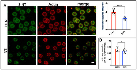 Overexpression of 3-nitrotyrosine (3-NT) in erythrocytes from patients with hypertension. (A) Erythrocytes from HTN and NTI were analyzed by confocal microscopy after immunofluorescence labeling with anti-3-NT (detected with Alexa-Fluor-488) and anti-actin (detected with Alexa-Fluor 568). Scale bar = 5 µm. Relative fluorescence units (RFU) showed a significant upregulation of 3-NT in 75 erythrocytes from three observation fields of HTN compared to NTI. Data are expressed as mean ± SE from three independent experiments (n = 3). Unpaired t-test, **** p < 0.0001. (B) Nitric oxide quantification using the Griess reaction revealed higher levels in erythrocytes from HTN compared to NTI. Unpaired t-test, * p = 0.0421.