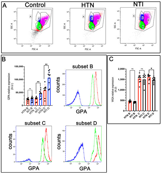 Decreased expression of glycophorin A (GPA) in erythrocytes from hypertensive patients. (A). Identification of three erythrocyte subsets based on forward and side scatter profiles (FSC-A vs. SSC-A) showing the whole population (A) and subsets (B, C, D) in control erythrocytes (without GPA antibody), and in GPA-labeled erythrocytes from HTN and NTI. (B). Relative quantification of GPA in erythrocyte subsets (B, C, D) from HTN and NTI. p = 0.2428T; ** p = 0.0076; ** p = 0.0041. Histograms for each subset are depicted. (C). WGA staining in erythrocyte subsets (B, C, D) from HTN and NTI. p = 0.1181; p = 0.9999; * p = 0.0037.