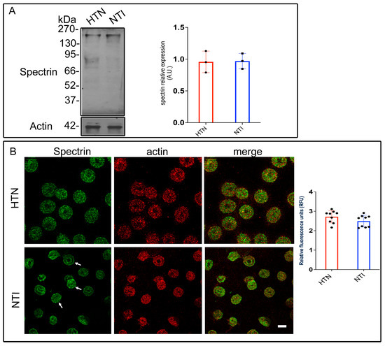 Quantitative confocal microscopy analysis indicated a trend toward increased spectrin levels in erythrocytes from HTN patients compared to NTI, although this difference was not statistically significant ( = 2.718 ± 0.1049 vs. 2.493 ± 0.1016; * p = 0.1441; Figure 4B).