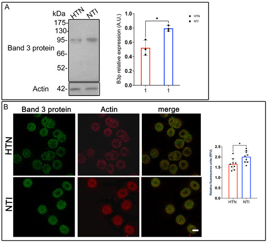 Interestingly, relative quantification via confocal microscopy showed a significant overexpression of B3p in erythrocytes from HTN patients compared to NTI ( = 1.657 ± 0.0879 vs. = 2.009 ± 0.09427; * p = 0.0147; Figure 5B).