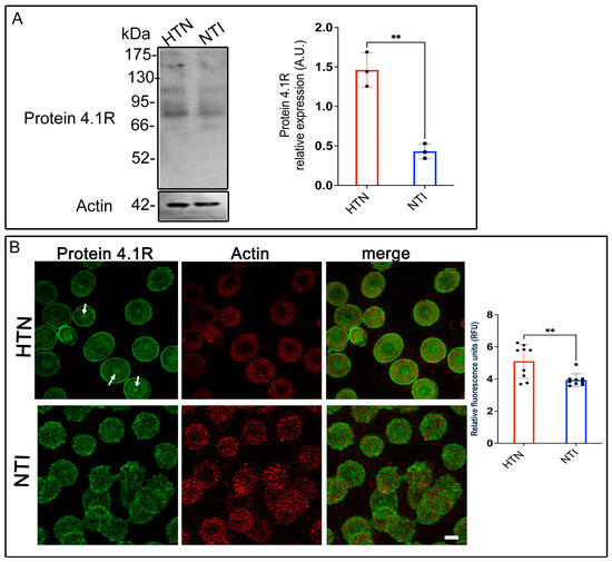 Increased expression of protein 4.1R in erythrocytes from hypertensive patients. (A). Erythrocytes from HTN and NTI were lysed and processed for Western blot analysis using an anti-protein 4.1R antibody (80 kDa). Relative protein expression was quantified using actin as a loading control. Values are presented as mean ± SE for three individuals per group. Unpaired t-test, ** p = 0.017. (B). Confocal microscopy analysis of erythrocytes from HTN and NTI double-labeled with anti-protein 4.1R (Alexa-Fluor-488) and anti-actin (Alexa-Fluor 568). Seventy-five cells from three independent experiments were analyzed. Scale bar = 5 µm. samples. Values shown are mean ± Standard Error (SE). Unpaired t test, ** p = 0.0065.