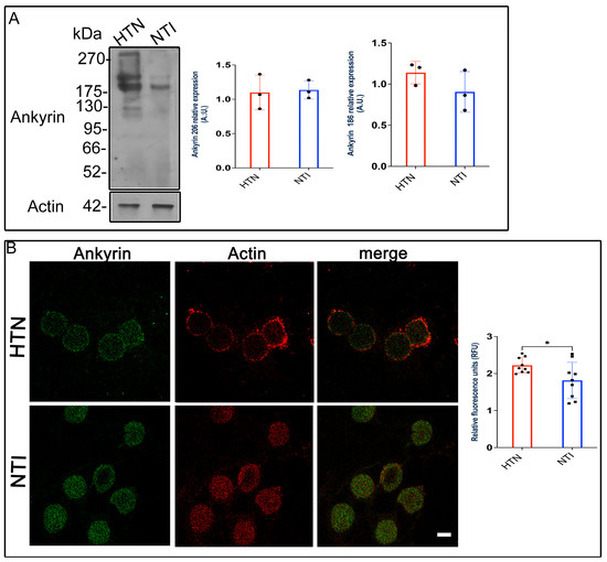 Interestingly, relative quantification of fluorescence intensity by confocal microscopy indicated a statistically significant increase in ankyrin expression in HTN erythrocytes compared to NTI ( = 1.766 ± 0.1837 vs. = 2.222 ± 0.0689; p = 0.0366; Figure 7B).
