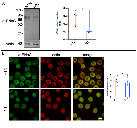 Overexpression of ENaC in erythrocytes from hypertensive patients. (A) Erythrocytes from HTN and NTI were lysed and processed for Western blot analysis using an anti-ENaC antibody (75 kDa). Relative protein expression was quantified using actin as a loading control. Values are presented as mean ± SE for three individuals per group. Unpaired t-test, * p = 0.0373. (B) Confocal microscopy analysis of erythrocytes from HTN and NTI double-labeled with anti-ENaC (Alexa-Fluor-488) and anti-actin (Alexa-Fluor 568). Seventy-five cells from three observational fields and three independent experiments were analyzed. Scale bar = 5 µm. Values shown are mean ± Standard Error (SE). Unpaired t test, * p = 0.0491.