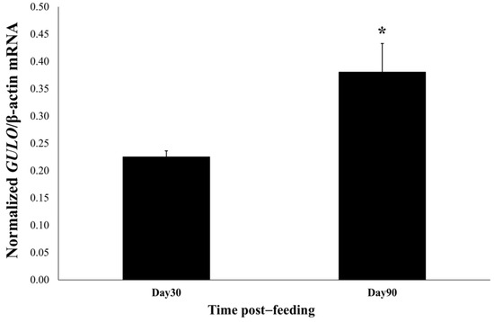 The expression levels of GULO mRNA in the intestine of Nile tilapia were compared between those fed experimental diets at 30 days and those at 90 days of the feeding trial (n = 3). The asterisk indicates significant statistical differences (p < 0.05).