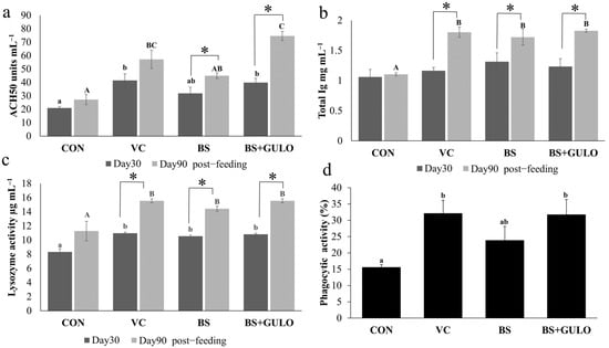 Immune parameters of Nile tilapia fed experimental diets for 30 days and 90 days of a feeding trial (n = 3). ACH50 (a); total Ig (b); LZM (c). Bars with asterisks indicate significant differences between day 30 and day 90 of the feeding trial, whereas bars labeled with different lowercase letters denote significant differences for day 30 of the feeding trial, and bars labeled with uppercase letters indicate significant differences for day 90 of the feeding trial, respectively (p < 0.05). Phagocytic activity (%) of phagocytic cells in PBLs of Nile tilapia fed experimental diets for 90 days of the feeding trial (d). Bars with different letters indicate significant differences (p < 0.05). Abbreviations: a basal diet (CON); a basal diet + vitamin C (VC); a basal diet + wild-type B. subtilis (BS); and a basal diet + recombinant B. subtilis (BS+GULO).