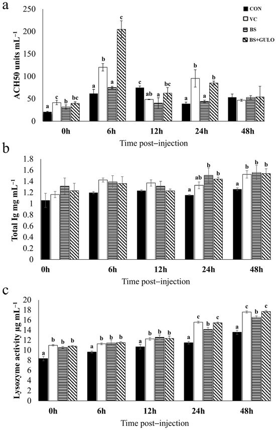 Immune parameters of Nile tilapia in response to S. agalactiae at different time points following the 30-day feeding trial (n = 3). ACH50 (a); total Ig (b); LZM (c). Bars with different letters indicate significant differences (p < 0.05). Abbreviations: a basal diet (CON); a basal diet + vitamin C (VC); a basal diet + wild-type B. subtilis (BS); and a basal diet + recombinant B. subtilis (BS+GULO).