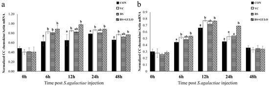 Quantitative real-time PCR analysis of CC chemokine expression in the spleen (a) and liver (b) of Nile tilapia in response to S. agalactiae at different time points following the 30-day feeding trial (n = 3). The different letters on each bar indicate significant differences at p < 0.05. Abbreviations: a basal diet (CON); a basal diet + vitamin C (VC); a basal diet + wild-type B. subtilis (BS); and a basal diet + recombinant B. subtilis (BS+GULO).