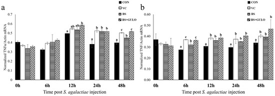 Quantitative real-time PCR analysis of tumor necrosis factor α expression in the spleen (a) and liver (b) of Nile tilapia in response to S. agalactiae at different time points following the 30-day feeding trial (n = 3). The different letters on each bar indicate significant differences at p < 0.05. Abbreviations: a basal diet (CON); a basal diet + vitamin C (VC); a basal diet + wild-type B. subtilis (BS); and a basal diet + recombinant B. subtilis (BS+GULO).
