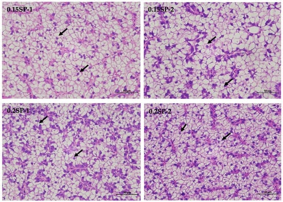 The results show that, in the liver tissues of the group supplemented by 0.05%SP–0.2%SP, the hepatocytes were arranged in two rows, forming a plate-like morphology and scattered sequentially around the central vein. Precisely, the hepatocytes were irregularly polygonal with nuclei centered or crowded on one side. In addition, the cytoplasm was vacuolated (black arrows), and there was no significant dilatation of hepatic blood sinusoids between the plates, and there was no necrotic or inflammatory cell infiltration. However, in the control group (Control-2), a few small focal infiltrations of lymphocytes were occasionally seen (blue arrows) (Figure 1).