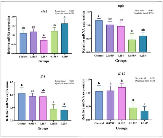 Figure 3 presents the expression of immune response-related genes. Briefly, the nfκb expression decreased in a parabolic fashion with increasing dietary SP contents (p < 0.05), with the least expression observed in the 0.1SP group, which, in turn, was lower than the 0.2SP group (p < 0.05). In addition, the expression of tnfα, il-10, and il-8 decreased linearly with increasing SP contents, and lower expressions of tnfα and il-8 were observed for the 0.15SP and 0.2SP groups relative to the control group (p < 0.05). Similarly, the il-10 expression levels were significantly down-regulated in the 0.15SP and 0.2SP groups (p < 0.05).