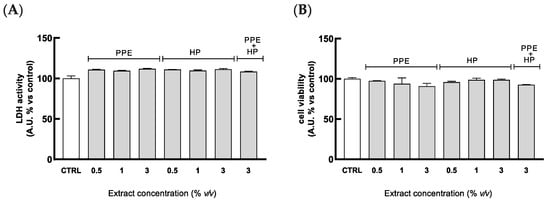 Firstly, HGECs were pretreated for 4 h with serial dilutions of PPE (0.5–3% v/v), HP (0.5–3% v/v), and PPE + HP (3% v/v), to evaluate their potential cytotoxicity. As shown in Figure 2A, all the extract dilutions (alone or combined) were not cytotoxic toward the cells, as indicated by the absence of significant alterations in LDH release in treated cells compared to the control. Higher concentrations, up to 5%, were cytotoxic when the formulations were combined. Moreover, the same treatments do not reduce cell metabolism, showing any changes in the formazan dye levels between samples and control, as illustrated in Figure 2B.