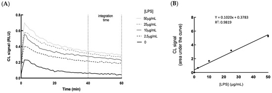 Kinetic profiles of H2O2 production in HGECs treated with LPS by using a chemiluminescent method. (A) CL kinetic profiles were acquired for HGEC cells upon CL probe incubation and treatment with different concentrations of LPS (2.5–50 µg/mL). (B) The dose–response curve showing the correlation between the CL signal and LPS concentration. Each point represents the mean ± SD of three independent measurements.