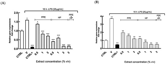 Figure 6 shows that TNF-α and MCP-1 gene expression was significantly increased (p ˂ 0.001) in HGEPs stimulated by LPS compared to control, as expected. A 4 h pretreatment with the extracts (at all concentrations) significantly counteracted the LPS-induced TNF-α (p < 0.05) and MCP-1 (p ˂ 0.001) expression, suggesting their possible anti-inflammatory role. The expression of these inflammatory markers is reduced by the extracts in a dose-dependent manner, with a stronger effect given by HP. Additionally, at the concentration of 3% (v/v), HP alone or in combination with PPE showed effects comparable to those given by Curcumin treatment, a well-established anti-inflammatory agent known for its potent activity against these cytokines [23,45]. This suggests that HP, particularly when used synergistically with PPE, may serve as a reliable alternative ingredient in managing inflammatory responses.