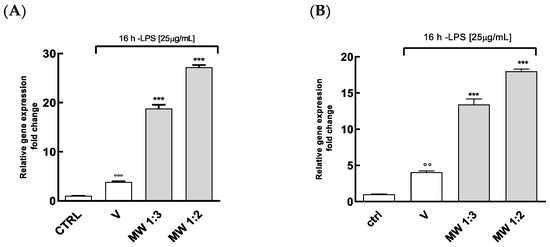 MCP-1 and TNF-α gene expressions in HGECs treated with MW formulations by using Real-Time PCR. HGECs were treated for 4 h with MW at the dilution 1:3 and 1:2 (range in content of punicalagin: 15.45–23.18 µg/mL, and range in content of lycopene: 0.25–0.37 µg/mL), followed by treatment with LPS (25 µg/mL) for 16 h. (A) TNF-α and (B) MCP-1 levels were assayed by Real-Time PCR. Results are expressed as the mean ± SEM of at least three experiments. *** p < 0.001, significantly different from the LPS-treated HGECs. °° p < 0.01, °°° p < 0.001, significantly different from control. Ctrl (control, untreated cells); V (cells treated with LPS).
