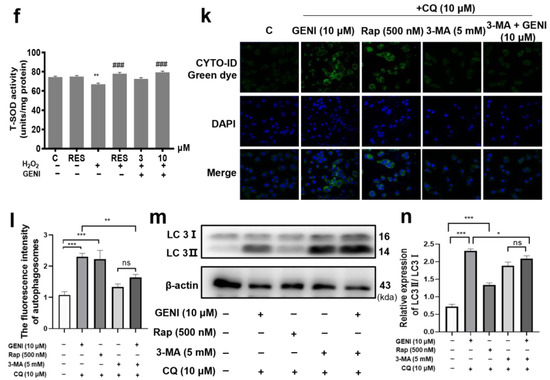 Autophagy is an important and conserved lysosomal degradation pathway that controls cytoplasmic quality by eliminating intracellular aggregates and damaged organelles to maintain neuronal homeostasis. Subsequently, we explored whether the neuroprotective effect of GENI in PC12 cells is due to autophagy induction. Compared with the control group, the fluorescence intensity of autophagosomes in the GENI group pretreated with CQ significantly increased, and the effect of GENI at 10 μM was comparable with that of positive control Rap at 500 nM, which showed that GENI promoted autophagy. Meanwhile, the autophagy induced by GENI was inhibited by the autophagy inhibitor, 3-MA (Figure 1k,l, p < 0.001, p < 0.001). Furthermore, the changes in the LC3 I/II at the protein level after treatment of GENI and 3-MA were also detected (Figure 1m,n, Supplementary Figure S1). As we expected, the LC3 II at the protein level in the GENI group was significantly increased compared with the control group. After treatment of 3-MA, the conversion of LC3 I to LC3 II induced by GENI was diminished by this inhibitor.