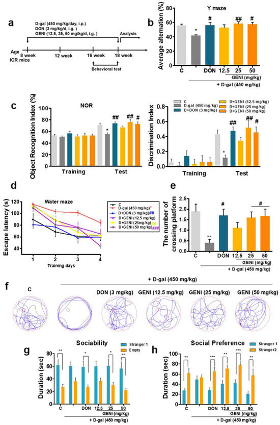 To evaluate whether GENI has anti-AD effects, AD mice were constructed by continuous intraperitoneal injection of D-gal at a dose of 450 mg/kg/day for 2 months as well as GENI was orally administered at doses of 12.5, 25, and 50 mg/kg/day (i.g.), respectively. DON at a dose of 3 mg/kg, which is the first-line clinical drug for AD treatment was used as a positive control (Figure 2a). After administering GENI for 2 months, we performed animal behavioral experiments to evaluate the changes in memory of mice. The results of Y-maze, NOR and MWM showed that the mice of the D-gal model group demonstrated cognitive decline and memory impairment, which indicated the successful induction of the AD model (Figure 2b–h). GENI in the 25 and 50 mg/kg administration groups could significantly increase the rate of alternating arms in the Y maze test (Figure 2b, p < 0.01, p < 0.05). The cognitive index and object recognition index in the NOR experiment significantly increased, which revealed that GENI significantly improved the learning and spatial memory of AD mice (Figure 2c, p < 0.01, p < 0.05). In the Morris water maze test, the escape latency of the GENI administration group was significantly reduced compared with that of the D-gal model group, and the number of crossing platforms significantly increased (Figure 2d, p < 0.01, p < 0.001; Figure 2e,f p < 0.05, p < 0.05). During sociability analysis, the mice in the GENI-administered groups showed significant social skills and social preferences (Figure 2g, p < 0.05, p < 0.01; Figure 2h, p < 0.01, p < 0.001, p < 0.01). The above results indicated that GENI could rescue the cognitive deficit and memory impairment of D-gal-induced AD mice, thereby improving learning and working memory, as well as social behavior.