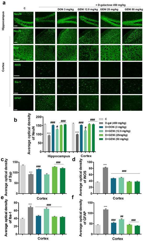 On the basis of the neuroprotective activity of GENI at the cellular level, the neuroprotective pharmacodynamics of GENI was evaluated at the animal level. Neurons are the basic units that constitute the structure and function of the nervous system, and synaptic transmission is essential for nervous system function. We performed immunohistochemical staining to detect neuronal and synaptophysin changes in the cerebral cortex and hippocampus (Figure 3a–c). Compared with the normal control group, the number of cortical and hippocampal mature neurons (NeuN) in the D-gal group was significantly reduced (Figure 3a,b, p < 0.001, p < 0.001), and the Syp intensity in the cerebral cortex was decreased (Figure 3a,c, p < 0.001). The GENI-treated groups and Don-treated group exhibited significantly increased mature neurons in the cerebral cortex and hippocampus compared with the D-gal group (Figure 3a,b, p < 0.05, p < 0.001, p < 0.001), and Syp intensity also significantly increased (Figure 3a,c, p < 0.001, p < 0.001, p < 0.001). In addition, the pathogenesis of AD was closely related to neuroinflammation [21]. The production of inflammatory cytokines and the expression of iNOS in the brains of patients with AD increased. The formation and appearance of Aβ plaques in the brain were associated with overactivation of microglia and astrocytes. Subsequently, we investigated the expression of iNOS, the changes in biomarkers of microglia, and astrocytes, Iba-1 and GFAP after GENI treatment, respectively. The expression of iNOS and activation of microglia and astrocytes in the cerebral cortex of the D-gal group significantly increased, respectively (Figure 3a,d, p < 0.001; Figure 3a,e, p < 0.001; Figure 3a,f, p < 0.001). However, these parameters in AD mice decreased after GENI and DON treatment (Figure 3a,d, p < 0.001, p < 0.001, p < 0.001; Figure 3a,e, p < 0.001, p < 0.001, p < 0.001, p < 0.001; Figure 3a,f, p < 0.01, p < 0.001, p < 0.001, p < 0.001). These results revealed that GENI like DON exerted neuroprotective effects by reducing the overactivation of microglia and astrocytes, and decreasing the release of pro-inflammatory factors, thereby improving memory dysfunction in D-gal-induced AD mice.