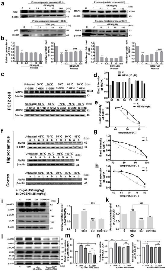 Screening candidates of target proteins of GENI. (a,b) Target protein candidates of GENI in DARTS analysis. The ratio of protease to protein was determined by pre-experiments as 50:1, 5:1, 100:1, and 50:1 (w/w), respectively. Data were presented as mean ± SEM. *** p < 0.001 represented a significant difference from the control group without pronase, ## p < 0.01, and ### p< 0.001 represented a significant difference from the control group treated with pronase. (c–e) The results of CETSA analysis for GENI and MAPK or AMPK proteins. (f–h) CETSA analysis for AMPK protein of hippocampus and cerebral cortex tissue and corresponding fitting curves. The samples of the control group and GENI treatment group were from D-gal model mice and D-gal model mice treated with GENI at 25 mg/kg. (i–k) Effect of Dor, an inhibitor of AMPK, on the effect of GENI in PC12 cells. Pre-treatment with the AMPK inhibitor Dor (500 nM) on PC12 cells for 30 min, treatment with GENI for 2 h, and analysis of the protein level of p-ULK1. n = 3 independent experiments. Data were presented as mean ± SEM. ** p < 0.01 and *** p < 0.001 and ### p < 0.001 represented a significant difference from the blank control group; $$$ p < 0.001 represented a significant difference from the GENI-treated group. (l–o) Effect of siRNA of AMPK on the effect of GENI in PC12 cells. Western blot analysis of p-AMPK, AMPK, p-ULK1, ULK1, LC3I/II after transfection with negative siRNA (NC siRNA) or AMPK siRNA, and treatment with GENI. Cells were transfected with lipofectamine 2000 and 80 nM siRNA for 6 h and then treated with GENI. n = 3 independent experiments. Data were presented as mean ± SEM. * p < 0.05, ** p < 0.01 and *** p < 0.001 represented a significant difference from the GENI-treated group, ns represented no significant difference from the GENI-treated group with AMPK-siRNA.