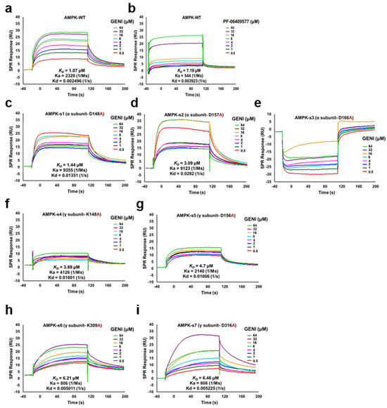 Interaction of AMPK and GENI, and binding sites confirmation of GENI with wild-type and mutants of AMPK by SPR analysis. (a,b) SPR analysis of GENI and PF-06409577 with purified AMPK protein of wild-type. (c–e) ASP148, 157, and 166 of AMPK α subunit were mutated into ALA148, 157, and 166, and the binding of AMPK mutants and GENI was measured by SPR. (f–i) LYS148, ASP156, LYS309, and ASP316 of AMPK γ subunit were mutated into ALA148, ALA156, ALA309 and ALA316, and the binding of AMPK mutants and GENI was measured by SPR. The contact and dissociation time were 120 s and 240 s, respectively, and the protein coupling amount was 10,000 RU.