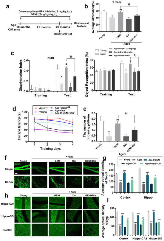 Effect of AMPK inhibitor on the anti-AD effect of GENI in natural aging AD mice. (a) Scheme of animal experiment. (b) Average alternation of mice in the Y-maze experiment. (c) Changes in the discrimination index and recognition index of mice in the NOR test. (d) Changes in escape latency of mice in each group on training days 1–4 in water maze test. (e) Number of crossing platforms of mice in each group on test day 5 in the water maze test. (f,g) Changes in the neurons in the hippocampus and cortex of the brain in mice after treating GENI and GENI plus Dor. (h,i) Effect of GENI and GENI plus Dor on Syp in the hippocampus CA1, DG and cortex. Scale bar, 100 μm. In the behavior test, the animal number was 8. In immunohistochemical staining, n = 7 pictures from 2 mice. Data were presented as mean ± SEM. * p < 0.05, ** p < 0.01, and *** p < 0.001 represented a significant difference from the young control group; # p < 0.05, ## p < 0.01 and ### p < 0.001 represented a significant difference from the aged control group. $ p < 0.05, $$ p < 0.01 and $$$ p < 0.001 represented a significant difference from the GENI-treated aged group.