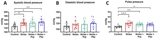 Effects of pharmacological interventions on noise-induced hypertension. (A) Systolic, (B) diastolic, and (C) pulse blood pressure on the final day of noise exposure. The results are presented as jitter plots with mean ± SD, where dots show the number of independent measurements per group. Significance is indicated as * and ** and *** when p < 0.05 and p < 0.01 and p < 0.001, respectively. Prp = propranolol; Pbz = phenoxybenzamine.
