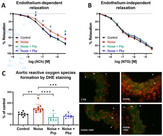 Effects of pharmacological interventions on noise-induced ROS formation and endothelial dysfunction in the aorta. (A) Endothelium-dependent relaxation in the presence of acetylcholine (ACh) and (B) endothelium-independent relaxation in the presence of nitroglycerin (NTG) of thoracic aortic rings, as measured by isometric tension method. The results are presented as mean ± SEM of n = 10–16 aortic rings per group. Significance is indicated as # when p < 0.05 between the noise-exposed group and pharmacologically treated groups. (C) Staining of aortic cryosections with dihydroethidium with representative images that show ROS formation (red fluorescence) and aortic lamina (green autofluorescence). A—adventitia, M—media, E—endothelium. The results are presented as jitter plots with mean ± SD of n = 6–10. Significance is indicated as ** and *** and **** when p < 0.01 and p < 0.001 and p < 0.0001, respectively. Prp = propranolol; Pbz = phenoxybenzamine.