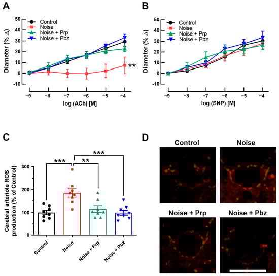 Responses of cerebral arterioles to vasodilators. (A) Responses to the endothelium-dependent vasodilator acetylcholine were impaired in arterioles from mice exposed to noise, indicative of endothelial dysfunction. In contrast, the β-blocker propranolol and the α-blocker phenoxybenzamine prevented vessels from noise-induced endothelial dysfunction. (B) Neither noise exposure nor additional treatment by propranolol or phenoxybenzamine affected endothelium-independent vasodilation induced by sodium nitroprusside. (C) A marked increase in ROS levels (as indicated by DHE staining intensity) was observed in the vascular wall of cerebral arterioles from noise-exposed mice. Remarkably, propranolol and phenoxybenzamine prevented ROS formation. (D) Representative pictures of DHE-stained cerebral arterioles’ cross-sections. The results are presented as mean ± SEM of n = 8 arterioles per group (** p < 0.01; *** p < 0.001). Scale bar = 20 µm. Prp = propranolol; Pbz = phenoxybenzamine; SNP = sodium nitroprusside.