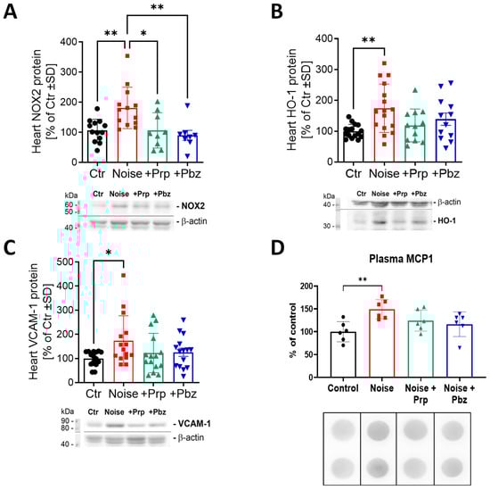 The increase in protein expression of NOX2 in cardiac tissue after noise exposure was significantly reduced after treatment with both propranolol and phenoxybenzamine, indicating protection against oxidative stress (Figure 5A). HO-1, an important antioxidant enzyme and a marker of nuclear factor erythroid 2-related factor 2 (NRF2) expression, was significantly increased by noise, indicating stress-induced antioxidant defense upregulation, which was again partially normalized by propranolol and phenoxybenzamine (Figure 5B). Both pharmacological interventions also prevented significant upregulation of the inflammation marker VCAM1, which was significantly increased in the noise-exposed group (Figure 5C). A similar pattern was observed in the circulating levels of MCP-1, showing a possible presence of systemic inflammation after noise exposure and successful mitigation by both pharmacological treatments (Figure 5D).