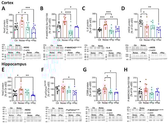 Protein markers of oxidative stress and inflammation in brain tissue. Protein expression of (A) NOX2, (B) P-MARCKSSer152/156, (C) IL-6, and (D) nNOS in the cortex and (E) NOX2, (F) P-p47phoxSer328, (G) CD68, and (H) P-MARCKS in the hippocampus were determined by western blot analysis. Representative images are shown below to the respective densitometric quantification. The results are presented as jitter plots with mean ± SD of n = 7–10 for each brain region. Significance is indicated as * and ** and *** and **** when p < 0.05 and p < 0.01 and p < 0.001 and p < 0.0001, respectively. Ctr = control; Prp = propranolol; Pbz = phenoxybenzamine.