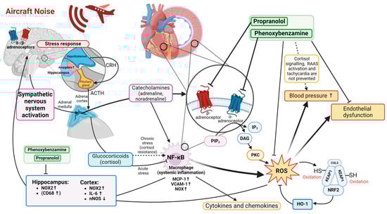 Mechanistic overview scheme of the effects of aircraft noise on endothelial function. Noise acts on the stress response pathway, activating the sympathetic nervous system and the hypothalamic–pituitary–adrenal (HPA) axis through the activation of the amygdala and the hypothalamus, by releasing corticotropin-releasing hormone (CRH) into the pituitary gland, further stimulating the release of adrenocorticotropic hormone (ACTH) into the circulation []. Sympathetic nervous system activation induces inflammation and oxidative stress through catecholamine release. Catecholamines bind to α- and β-adrenergic receptors in the brain, on immune cells, and on vascular/cardiac tissue, which promote downstream activation of ROS-releasing enzymes and mediators of inflammation, leading to endothelial dysfunction. Treatment with α- or β-receptor blockers reduced markers of inflammation and oxidative stress in both the cardiovascular and brain tissue and alleviated the negative effects on the endothelial function. Some of the depicted pathways were summarized from previous work []. Arrows up or down nearby protein names mean up- or downregulation of protein. Created with BioRender.com.