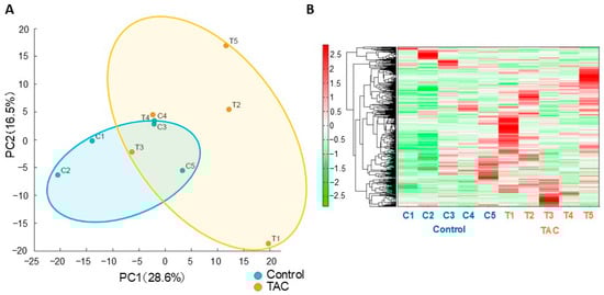 A total of 527 metabolites were detected, and 56 of these showed significant changes after TAC administration (Figure 1A,B). PCA and HCA suggested different metabolic distributions between the TAC and control groups.