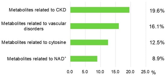 Categories of metabolites in blood samples are shown in Figure 2. The main metabolite categories included are 11 metabolites related to uremic toxins (19.6%), 9 related to vascular damage (16.1%), 7 related to cytosine metabolism (12.5%), and 5 related to nicotinamide adenine dinucleotide (NAD+) metabolism (8.9%) (Figure 2). Several metabolites overlapped between these groups (Supplemental Table S1).
