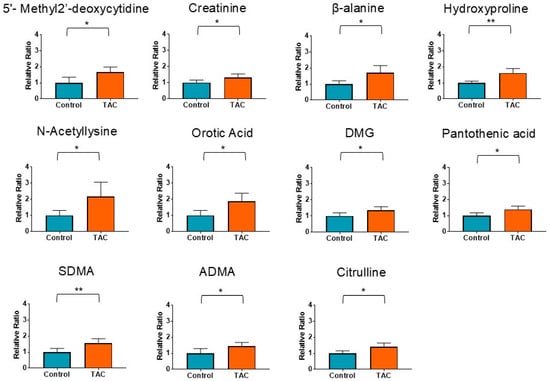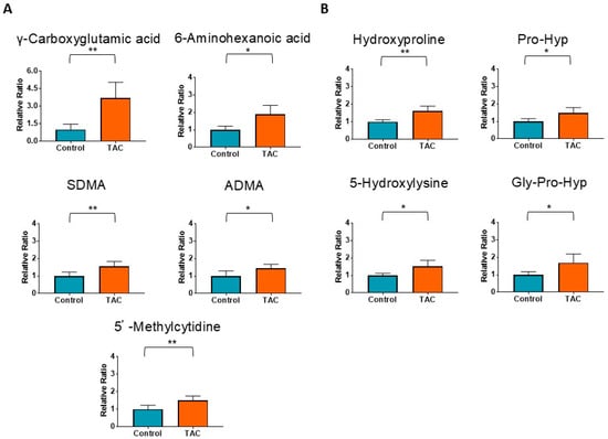 Figure 4. Metabolites related to vascular disorders measured by metabolomic analysis. Orange columns represent the TAC group, and blue columns represent the Control group. The vertical axis is the relative ratio. The ratio was calculated as follows: the relative ratio = normalized ratio of Tac group/normalized ratio of control group. (A) shows metabolites suggesting vascular damage. (B) shows metabolites as degradation products derived from collagen. (* p < 0.05, ** p < 0.01) (n = 5/group). DMG: N, N-Dimethylglycine; SDMA: symmetric dimethylarginine; ADMA: asymmetric dimethylarginine.